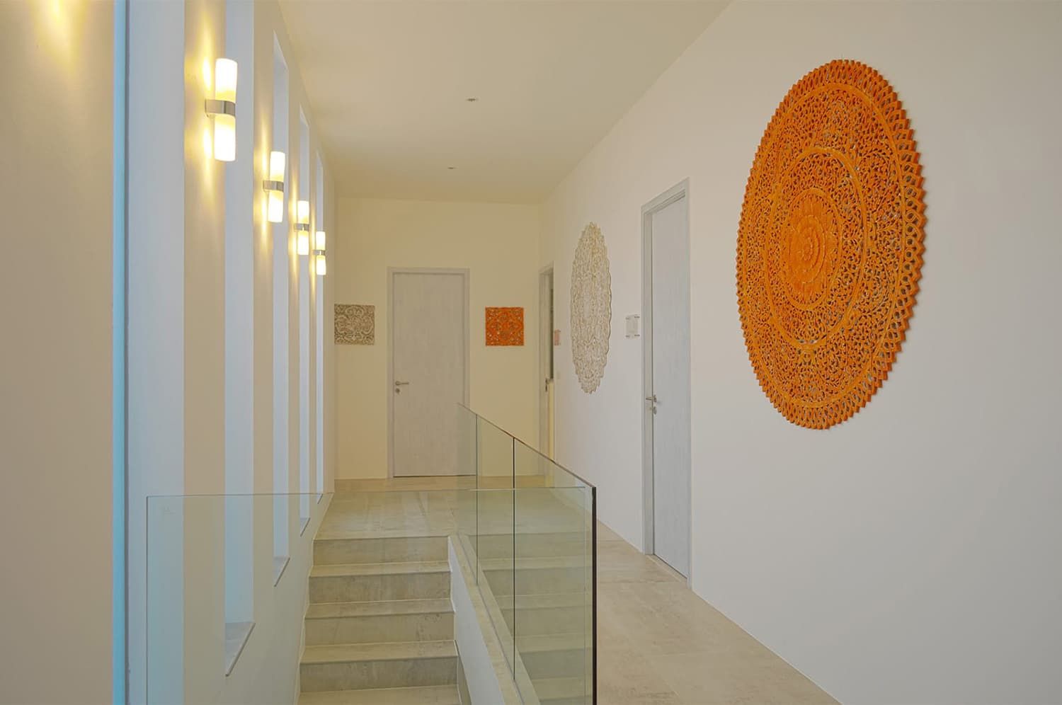 Upper Floor: King bed or two large single beds with large luxury en-suite bathroom, feature glass walls, large indoor walk-in rain & rail shower. High-vaulted ceiling, contemporary artworks, built-in wardrobes, vanity table, sitting area, personal bar, safe, plus private terrace with panoramic sea views.