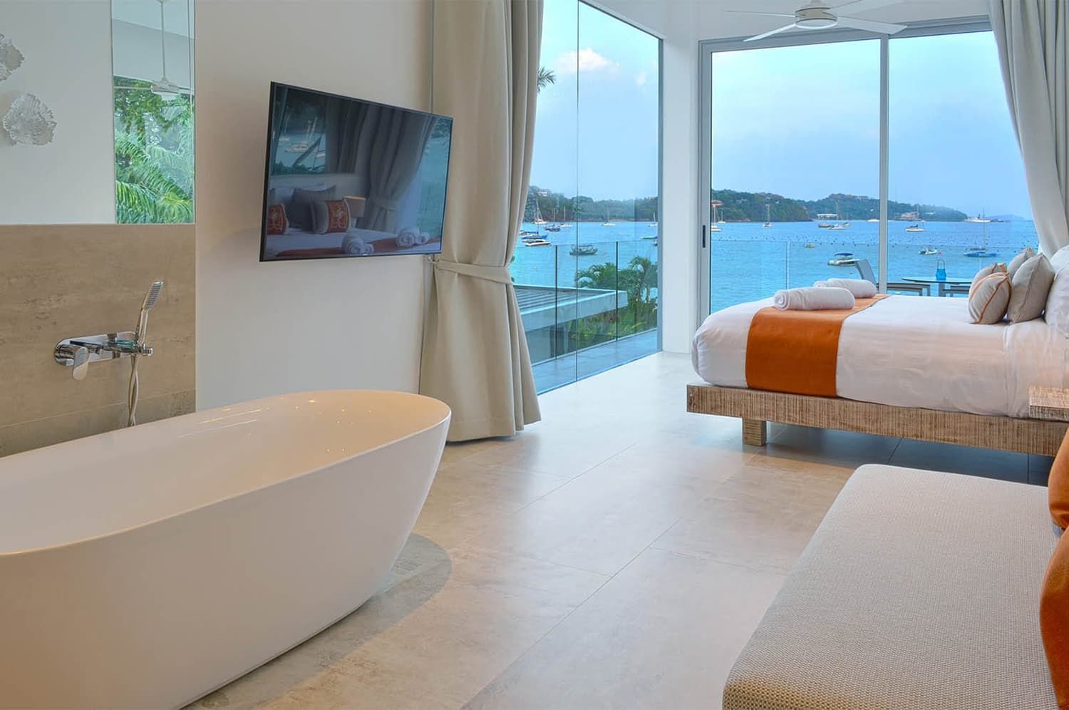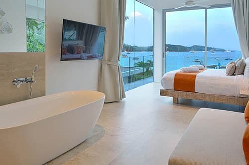 Upper Floor: King bed or two large single beds with large luxury en-suite bathroom, with double ended bath tub, feature glass walls, large indoor walk-in rain & rail shower. High-vaulted ceiling, contemporary artworks, built-in wardrobes, vanity table, sitting area, personal bar, safe, plus private terrace with panoramic sea views. Luxury 2-person private bath tub.