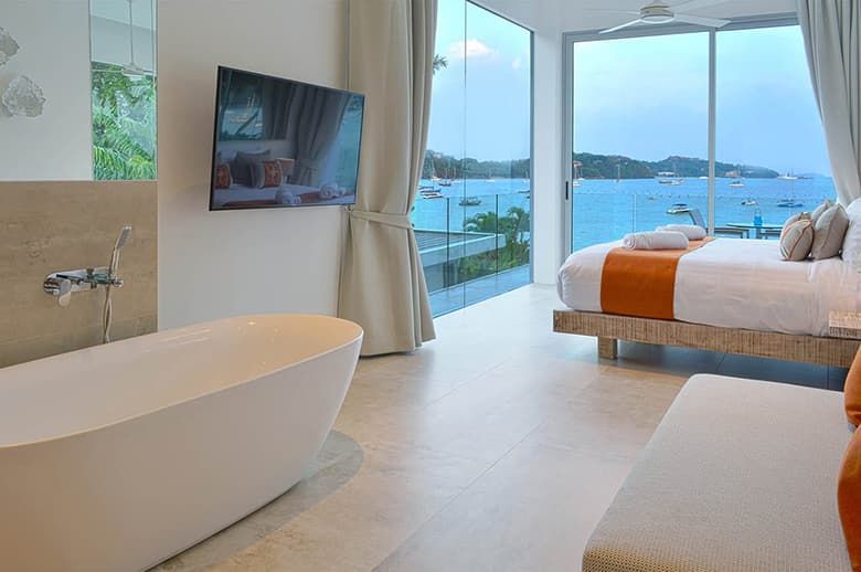 Upper Floor: King bed or two large single beds with large luxury en-suite bathroom, feature glass walls, large indoor walk-in rain & rail shower. High-vaulted ceiling, contemporary artworks, built-in wardrobes, vanity table, sitting area, personal bar, safe, plus private terrace with panoramic sea views.Ratings & reviews