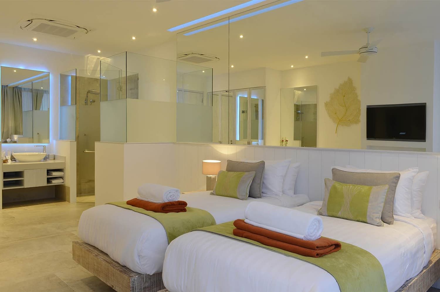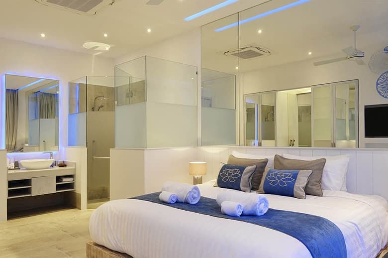 Upper Floor: King bed or two large single beds with large luxury en-suite bathroom, feature glass walls, large indoor walk-in rain & rail shower. High-vaulted ceiling, contemporary artworks, built-in wardrobes, vanity table, sitting area, personal bar, safe, plus private terrace with panoramic sea views.